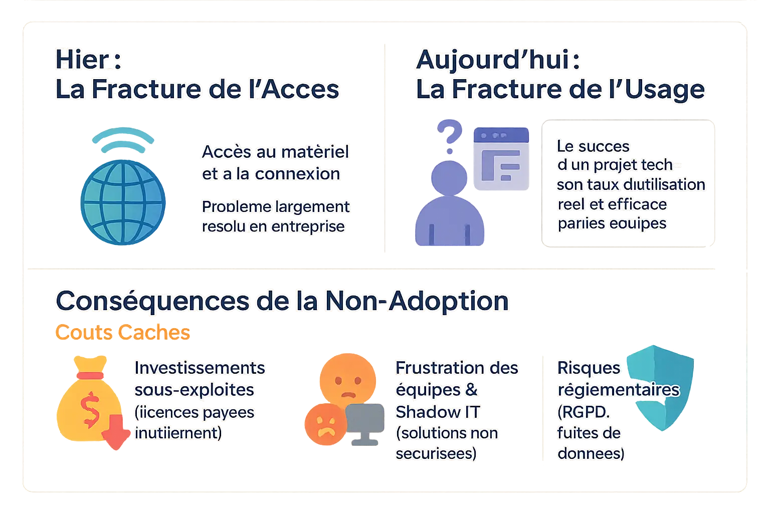 Vos équipes sont-elles suréquipées en logiciels mais sous-performantes, un paradoxe de plus en plus courant dans les organisations ? La véritable fracture numérique ne concerne plus l’accès à la technologie, mais bien la fracture numérique de l’utilisation des outils, un constat qui redéfinit en profondeur les enjeux de productivité, de sécurité et de conformité. Cet investissement massif dans le numérique ne porte ses fruits que si l’adoption est réelle et maîtrisée par les collaborateurs. Cet article décrypte pourquoi cette adoption est devenue le principal levier de performance et comment le rôle des DSI doit évoluer pour se muer en architecte de la confiance numérique.